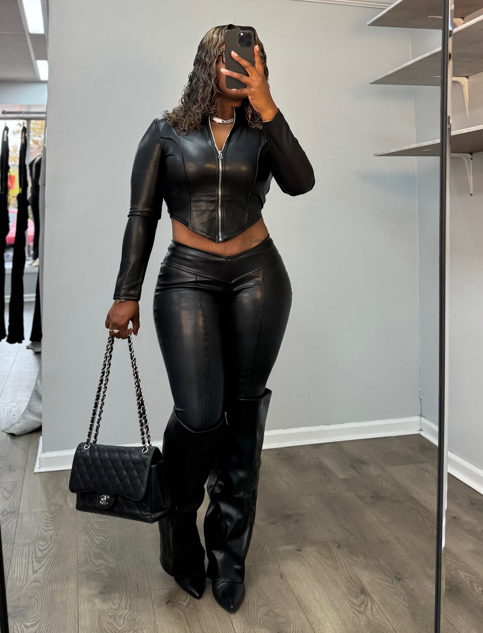 leather biker jacket and bell bottom set